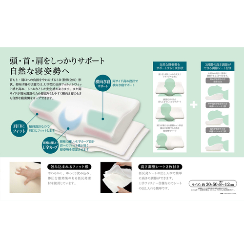 3段階の高さ調節が簡単にできる 仰向け、横向き寝を考えたまくら「メディピロー2」 高反発タイプ 幅50×奥行30cm 高さ8〜12cm モリシタ