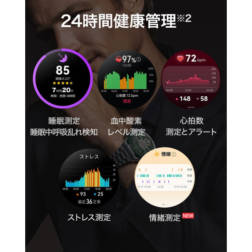 【24時間健康管理】:血中酸素レベル、心拍数、ストレス、睡眠など、様々な測定を行い、ユーザーの健康管理をサポート。