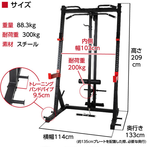 バーベルを損傷から保護するため、厚めのパッドを採用。着脱のしやすいクイック式バーベルホルダー。28mm用プレートが65kgまで収納できるプレートラックなど細部までこだわった本格派です。