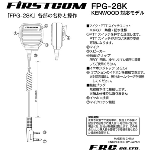 エフ・アール・シー FPG-28K 【PROシリーズ】防水スピーカーマイク(KENWOOD 2PINプラグ対応) FIRSTCOM