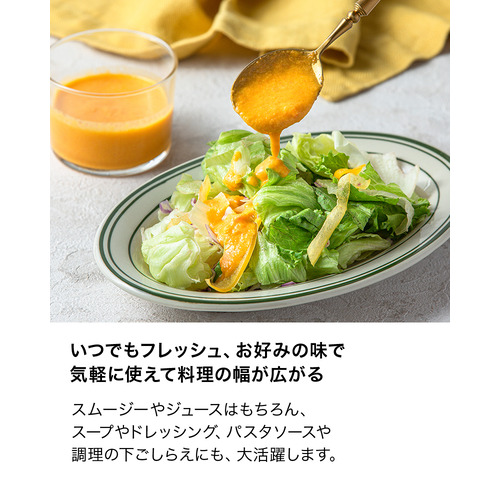 パワフルなかくはん力で、スムージーやジュースのみならず、ドレッシングやスープなど様々な用途に気軽に使えて食卓が鮮やかに。レシピ集が製品に同梱されているので、レシピの幅も広がります。
