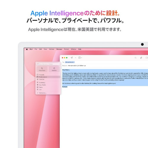 ※1 Apple Intelligenceは、M1以降を搭載したMacの全モデルで、macOS Sequoiaのアップデートの一部としてベータ版で利用できます。Siriとデバイスの言語を英語(米国)に設定する必要があります。英語(オーストラリア、カナダ、アイルランド、ニュージーランド、南アフリカ、英国)には今年の12月に対応します。一部の機能の公開と日本語、中国語、英語(インド、シンガポール)、フランス語、ドイツ語、イタリア語、韓国語、ポルトガル語、スペイン語、ベトナム語などの追加言語への対応は、今後1年にわたり開始される予定です。