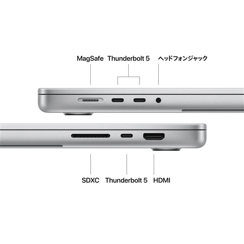 16インチMacBook Proは、3つのThunderbolt 5ポート、MagSafe 3充電ポート、SDXCカードスロット、HDMIポート、ヘッドフォンジャックを搭載。