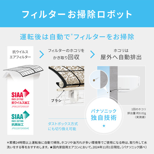 ・ナノイーXを生かしてお部屋の有害物質を抑制(※約8畳試験空間での〈カビ菌〉約2時間後の抑制効果。約6畳試験空間での〈花粉〉約3時間後、〈ニオイ〉約15分後、〈PM2.5〉約12時間後、〈アレル物質〉約6時間後の抑制効果。約6畳密閉試験空間での〈浮遊菌〉約4時間後〈付着菌〉約8時間後、〈浮遊ウイルス〉約3.5時間後〈付着ウイルス〉約2時間後の抑制効果です。数値は実際の使用空間での試験結果ではありません。脱臭効果は、周囲環境(温度・湿度)、運転時間、臭気、繊維の種類によって異なります。※) ・全自動お掃除(※「全自動お掃除」とは、屋外へのホコリ排出までを自動で行う当社独自のエアフィルターお掃除機能「フィルターお掃除ロボット」。さらにナノイーXをキーデバイスとした「内部クリーン」や、ホコリや汚れの付着を低減できる熱交換器の「ホコリレスコーティング」、送風ファンの「防汚・防カビコーティング」。加えて、高温多湿の状況を見張ってカビ抑制を自動で行う「カビみはり」の搭載により、エアコン本体の清潔性を持続。※)&エアコン内部のカビ菌の「除菌」(★生えてしまったカビを除去する機能ではありません★)(※【試験機関】(一財)北里環境科学センター【試験方法】27.7m3(約6畳)、室温25度、湿度70%の試験室にて、エアコン内部にカビ菌を滴下した試験片を設置、1日3時間の冷房運転後に「内部クリーン」運転ありとなしの条件において、4日間のカビ菌の数を比較【試験結果】試験片のカビ菌(1種類)が99%除去されたことを確認(北生発2021_1202号)※)でキレイをキープ