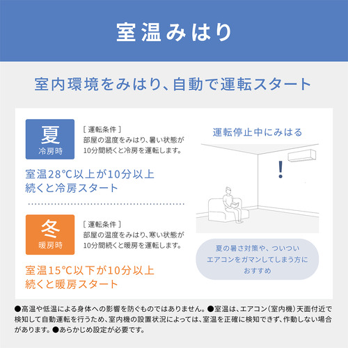 ・天井シャワー気流で直接体に冷風をあてない ・熱中症の増加を背景に、室温みはりの制御を改善