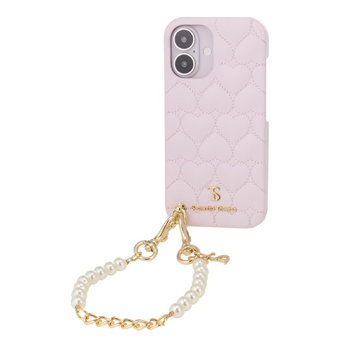 ハートキルトデザインの可愛らしい印象のカバー。パールとゴールドのスマホストラップ付き。