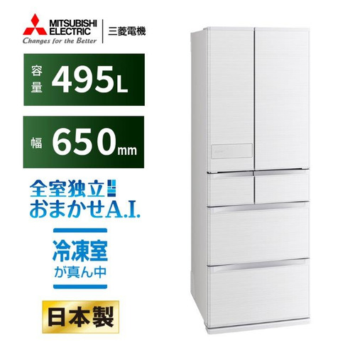 三菱電機 冷蔵庫 495L 観音開き 6ドア 幅65cm 切れちゃう瞬冷凍 氷点下ストッカーD できちゃうV冷凍 MR-JW50M-W ホワイト系 2025年製