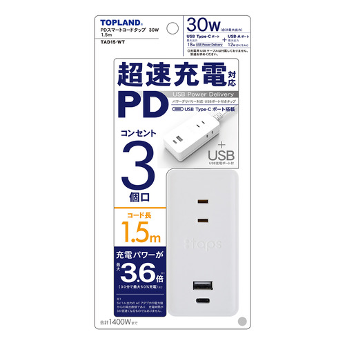 エレコム T-U08-3A2C215WH 延長コード 電源タップ USB タップ 1.5m コンセント 3口 Type-C ×2 USB-A ×2 PD 20W 雷ガード ホワイト