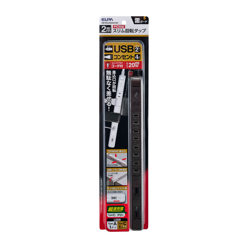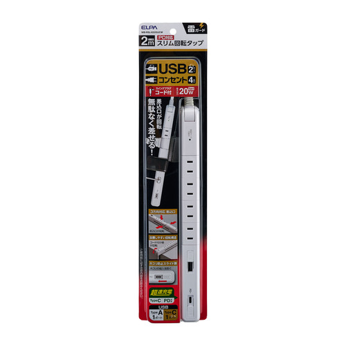 ELPA WBRSL4222SUCWD 耐雷スリム回転USBタップ 4個口 USB-Ax1 Type-Cx1 PD対応 2m